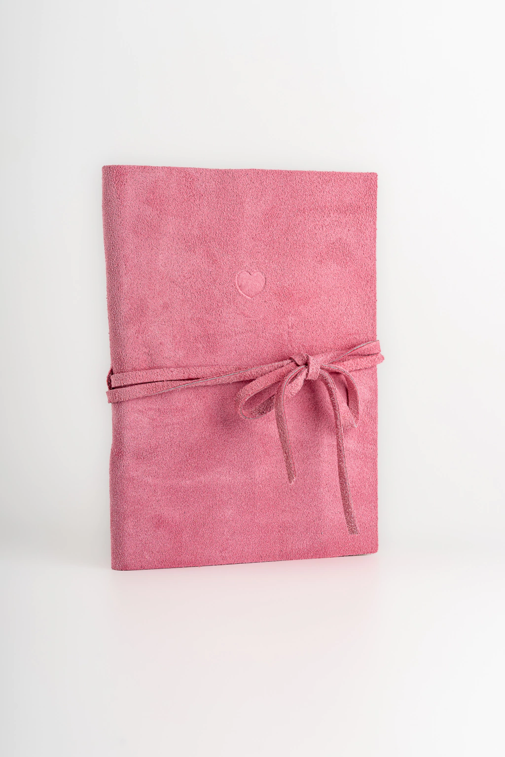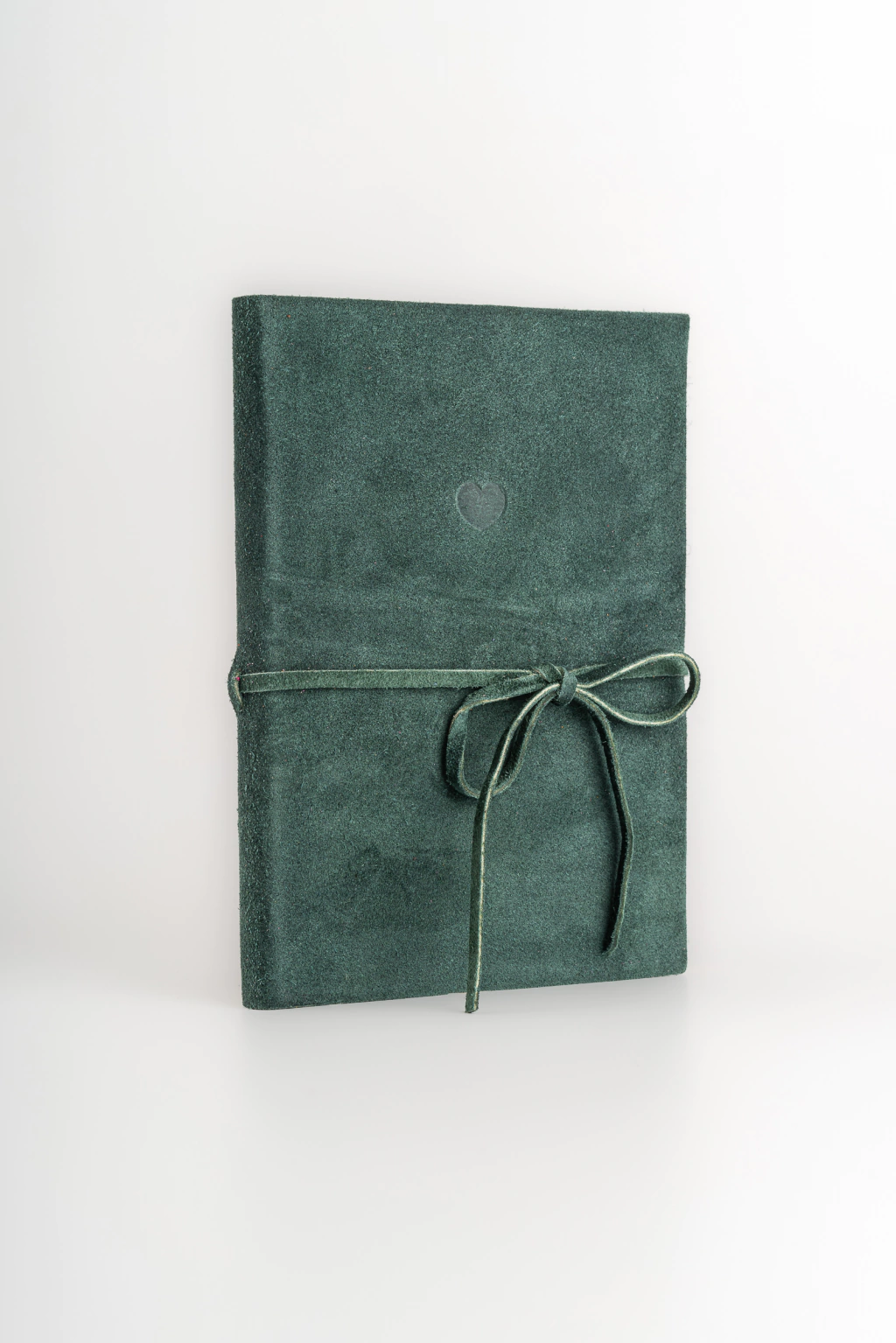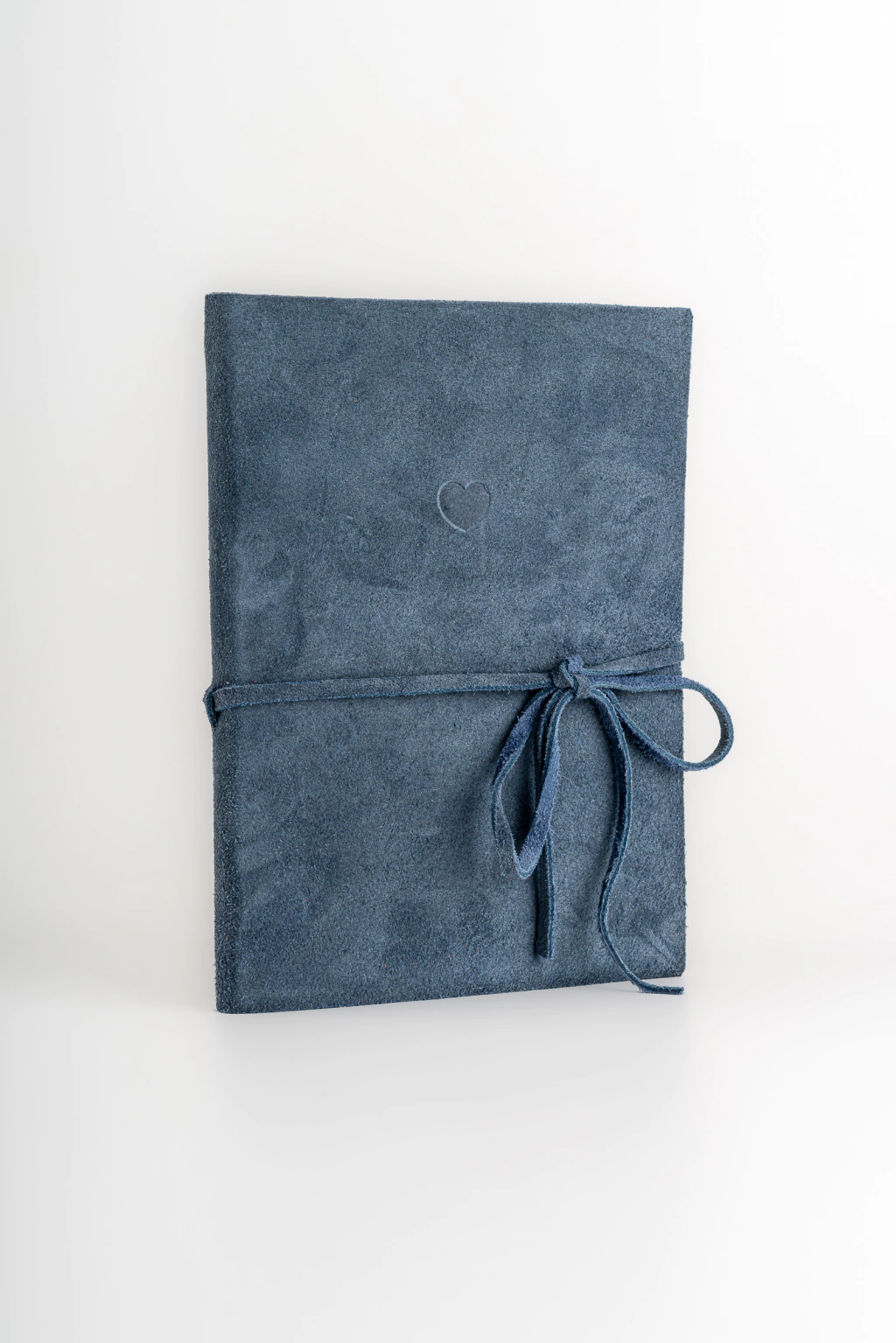 Encuadernado en gamuza, cierre con lazo, grabado sobre la tapa.